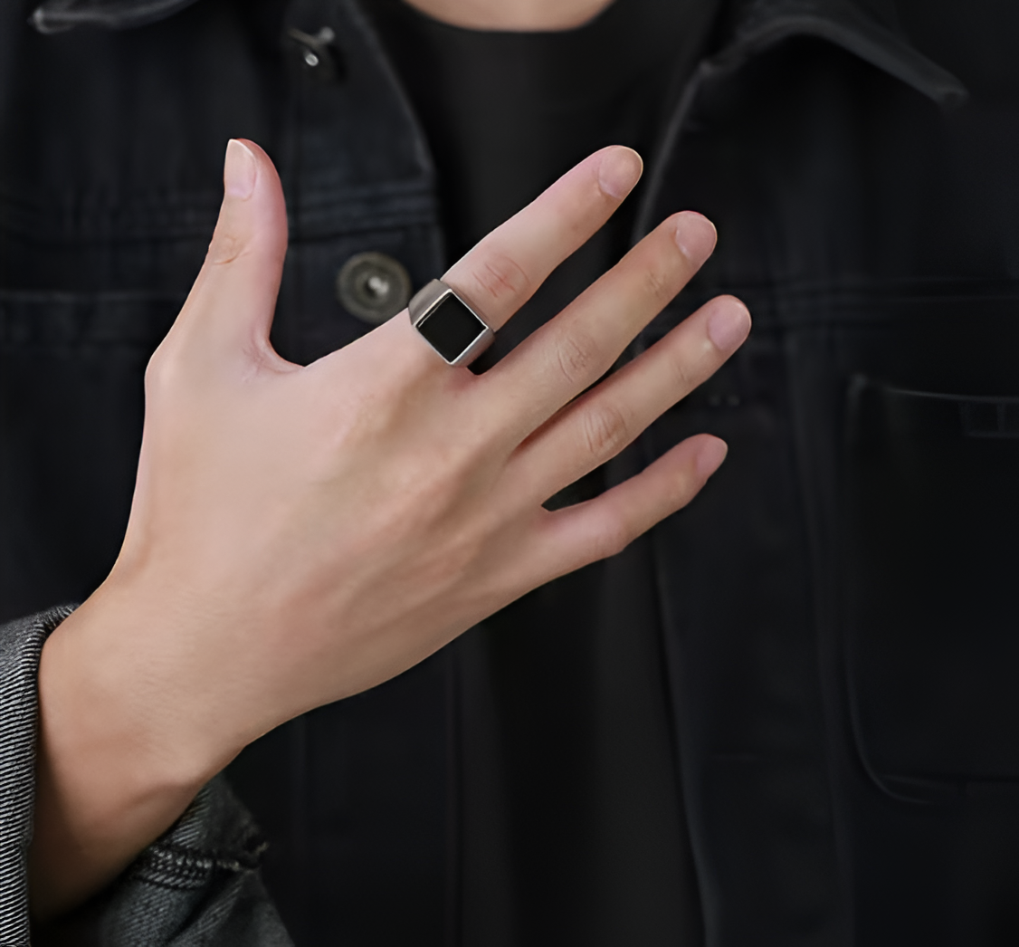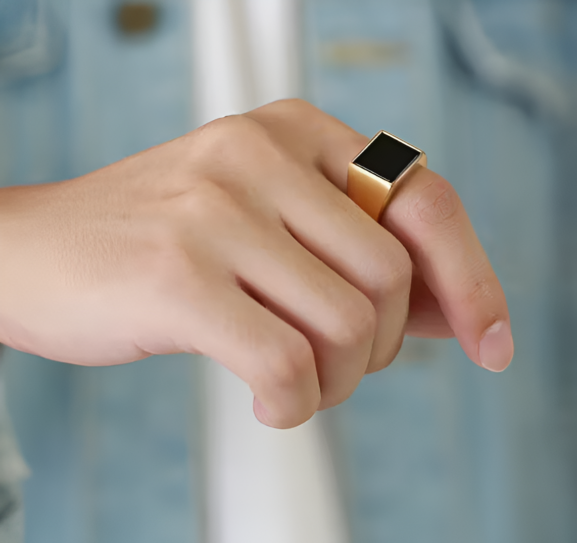 - Black Onyx Centerpiece: The deep black onyx stone provides a striking contrast, symbolizing strength and protection.