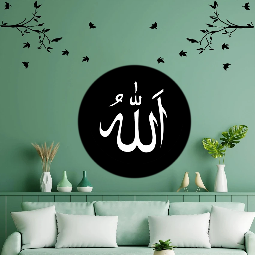 Bring a calming spiritual energy into your home with this wall hanging that highlights the name of Allah in striking white calligraphy on a black circular background. Paired with nature-inspired decorative accents—greenery, ceramic vases, and peaceful bird figurines—this art piece merges faith with contemporary design. It enhances your room’s ambiance while reflecting devotion and mindfulness.