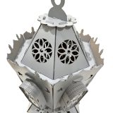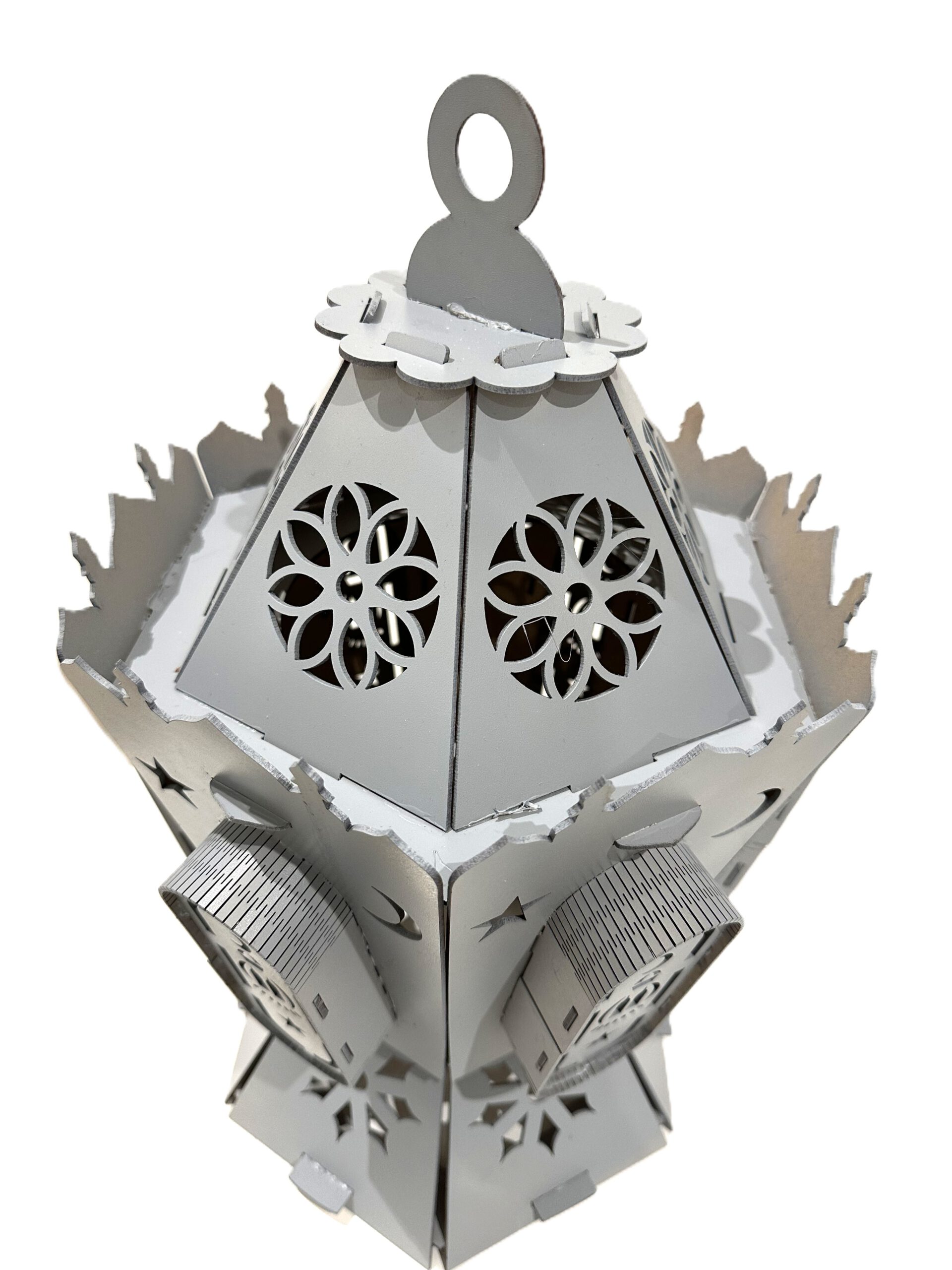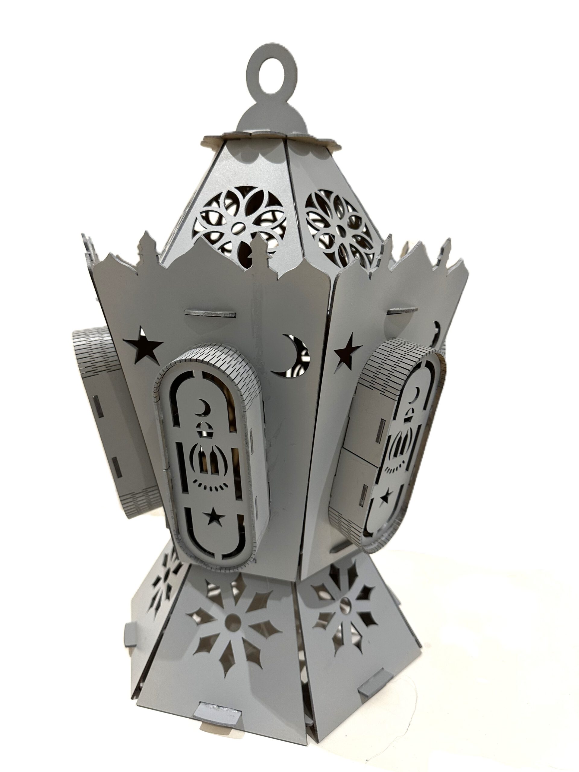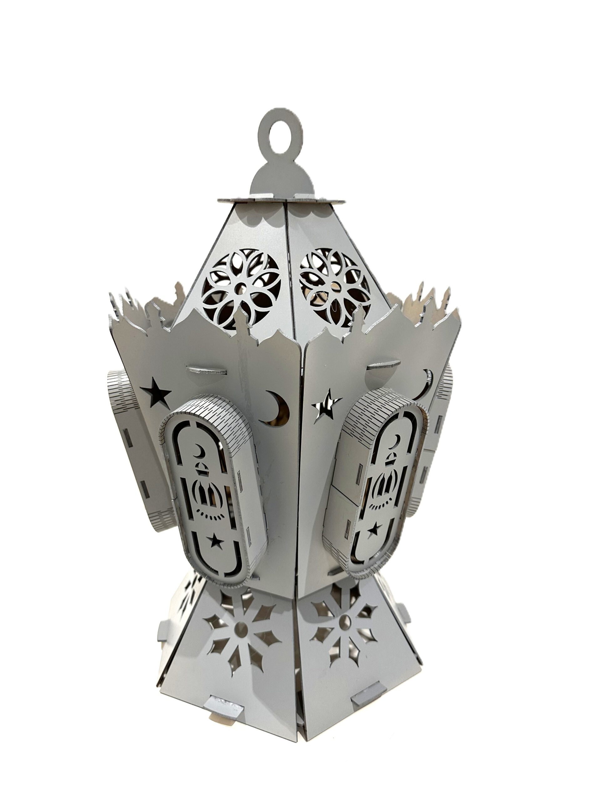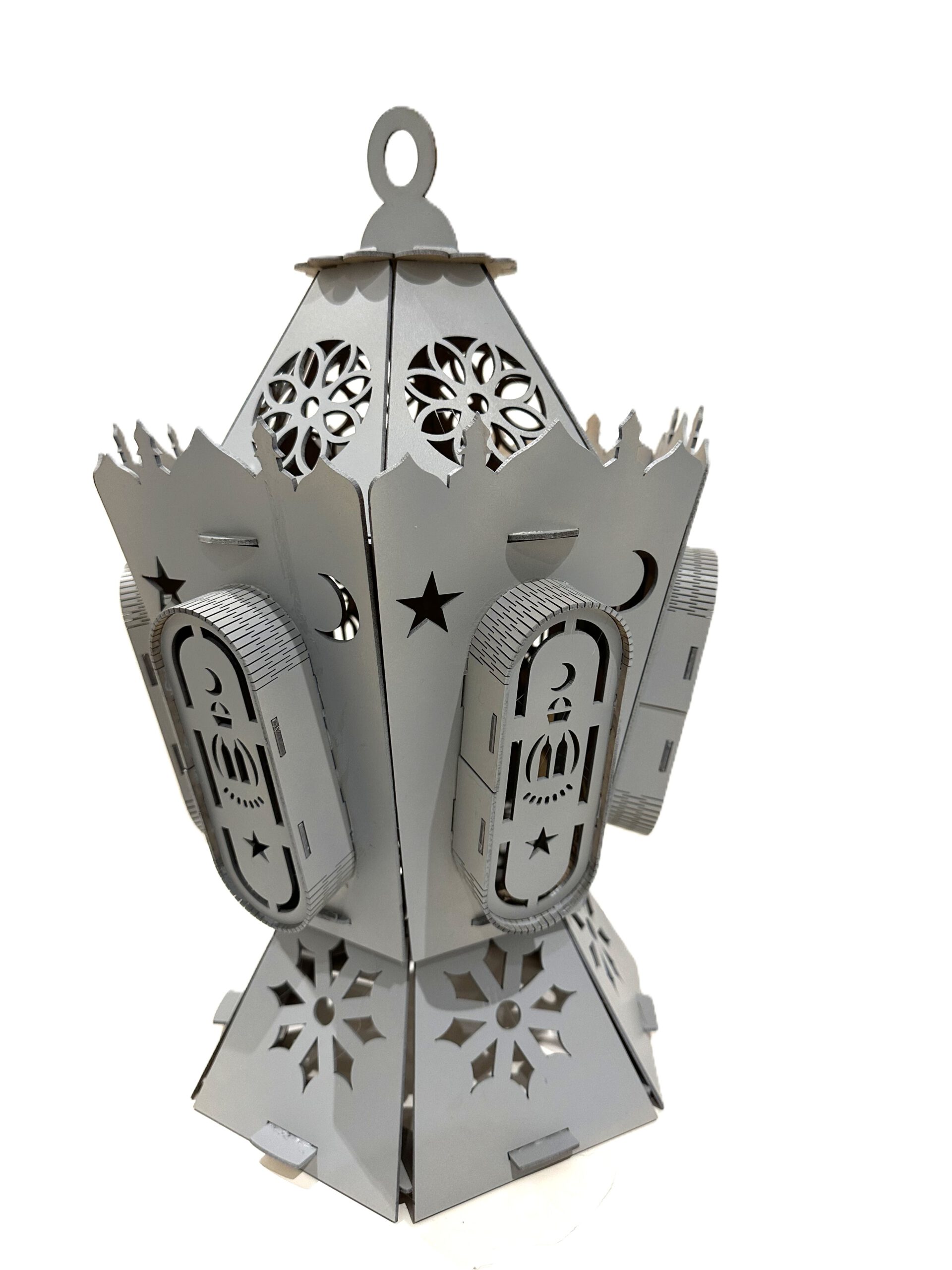This finished decorative lantern is designed for elegant home use and special occasions such as Ramadan and Eid. Crafted with detailed cut-out patterns and a classic lantern shape, it creates a warm and peaceful atmosphere when illuminated. The intricate star, moon, and ornamental motifs reflect traditional Islamic design while maintaining a modern, stylish look.