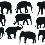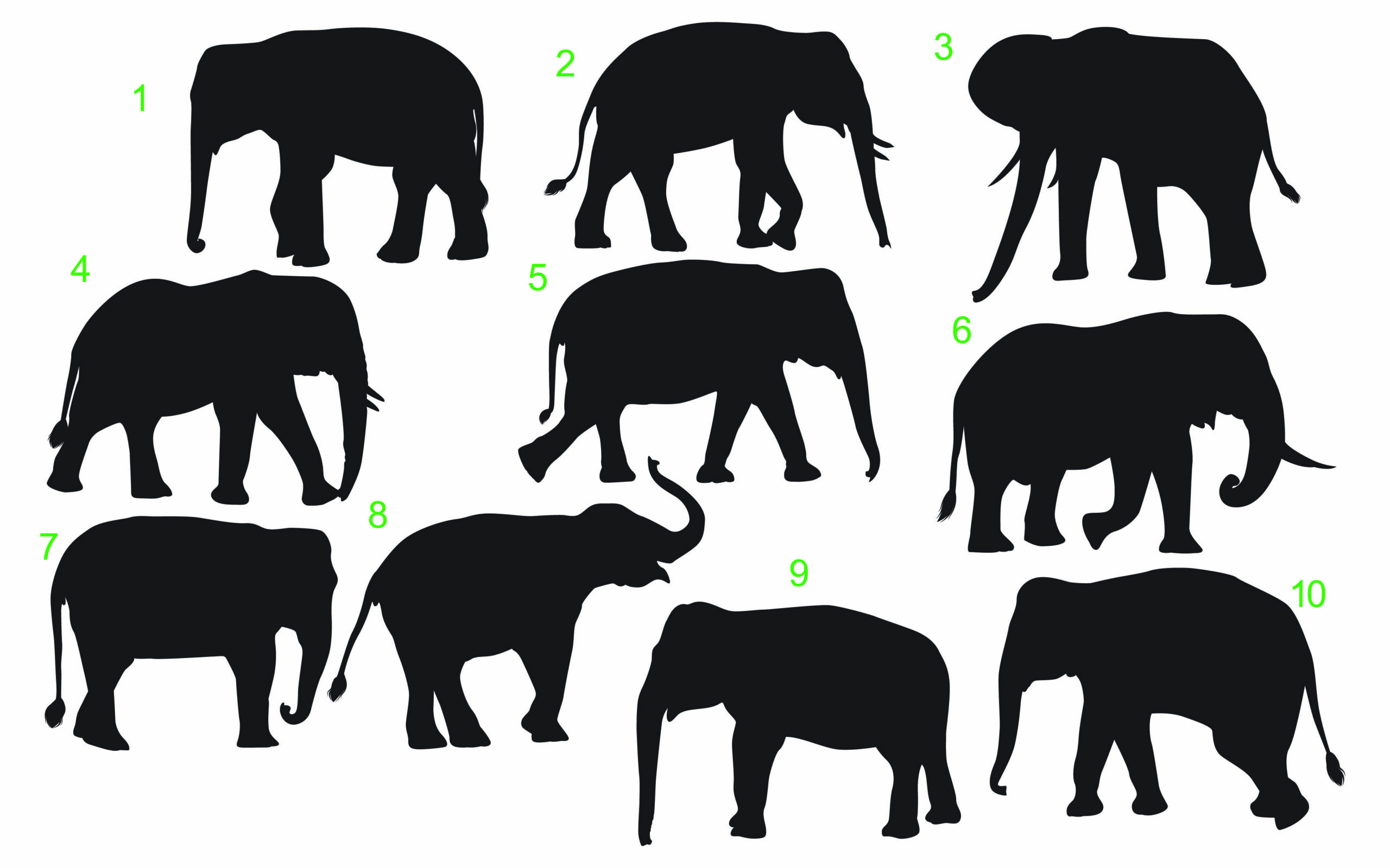 The composition includes ten distinct elephant silhouettes, each positioned in a way that suggests movement and natural behaviour. The silhouettes are arranged in a grid-like pattern, providing a balanced and orderly presentation. Each elephant is uniquely posed, from walking and standing to lifting its trunk, offering a diverse representation of the animal.