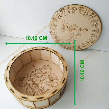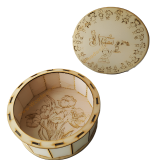 This image features a finely crafted cylindrical plywood memory box with artistic details. The box is designed with precision laser cuts and engravings that enhance its aesthetic appeal. The lid of the box is beautifully adorned with a variety of intricate designs and text that reads “Journal,” surrounded by various small icons like a camera, airplane, and musical notes, suggesting themes of travel, music, and memories. Inside, the box has a floral motif engraved at the bottom, adding a delicate touch to its overall design. This multipurpose box can serve various functions such as a jewellery holder, a decorative gift box, or even a floral tea storage container, making it a versatile and elegant choice for storing cherished items or as a thoughtful gift.
