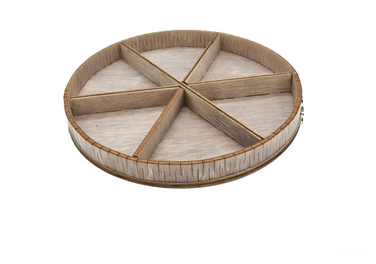 Serve your favourite treats in style with this Rustic Wooden Snack Organizer. Crafted from durable plywood, this round tray features six equally divided sections, perfect for offering a variety of nuts, candies, dry fruits, or appetizers. Its natural wood finish brings a cozy, farmhouse charm to any gathering, making it ideal for parties, picnics, or family movie nights. The raised sides keep everything in place, ensuring a clean and organized presentation.