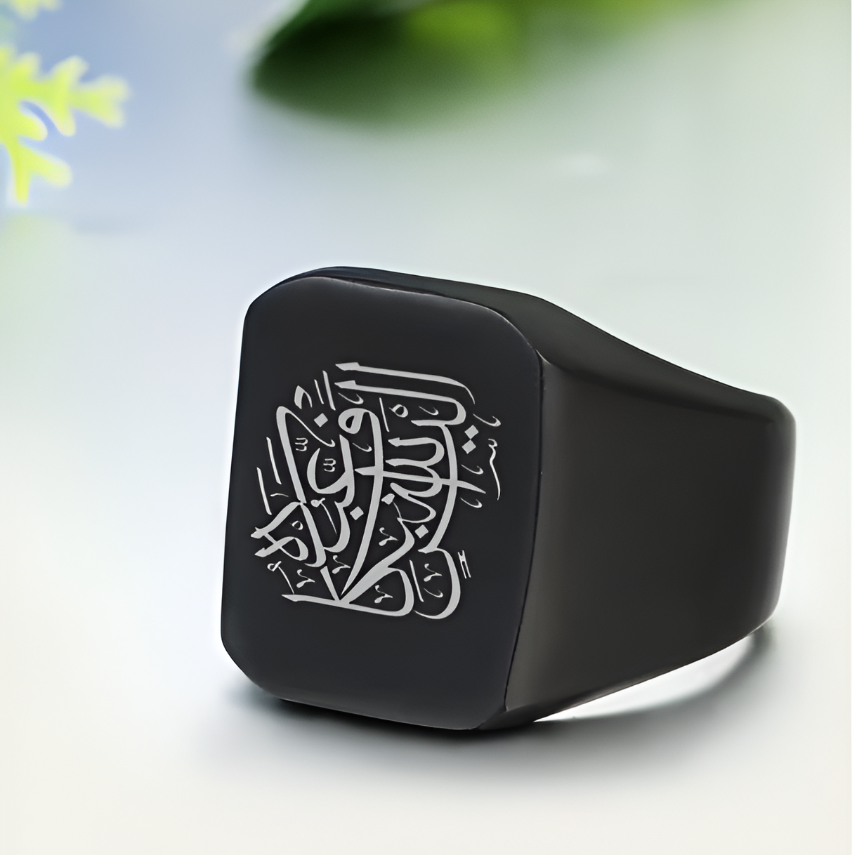 Discover the elegance and spiritual beauty of our Islamic ring, meticulously crafted from high-quality steel and titanium. This ring features a sleek black finish with a permanent color coating that ensures lasting durability and resistance to fading. The centerpiece of this exquisite piece is the beautifully engraved Arabic word “Alesallah” — a meaningful and artistic expression of faith and devotion.
