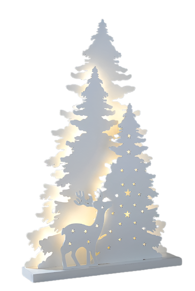 The Illuminated Plywood Christmas Tree with Reindeer is a captivating holiday decoration that combines traditional Christmas elements with modern design. Crafted from high-quality plywood, this elegant piece features two beautifully designed Christmas trees with intricate cut-outs of stars and a reindeer. The addition of LED lights adds a warm and inviting glow, making it a standout decoration for any holiday setting.