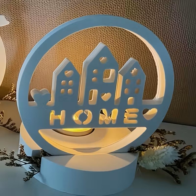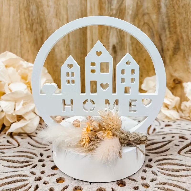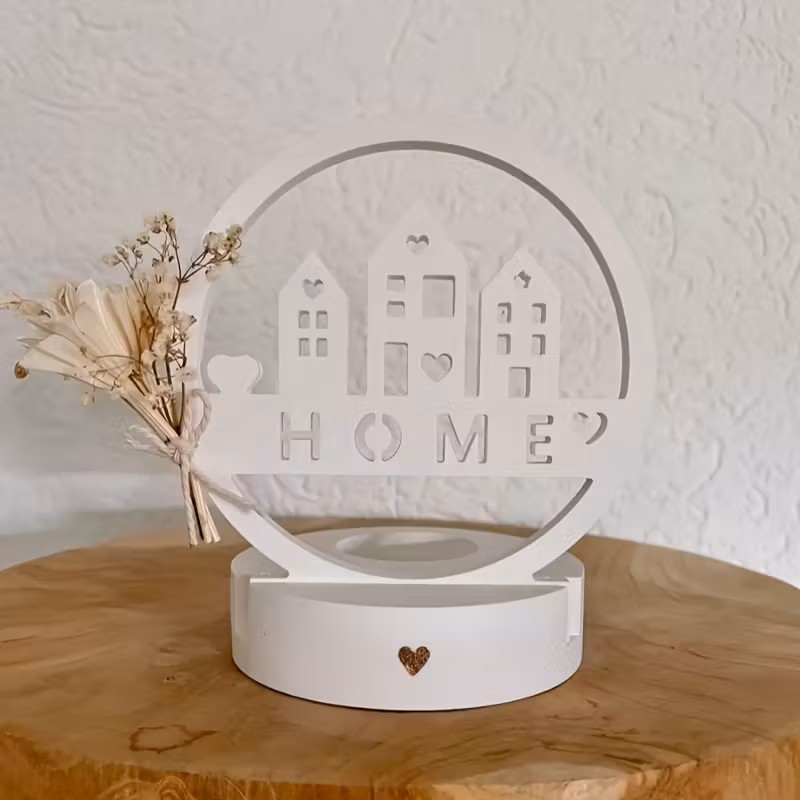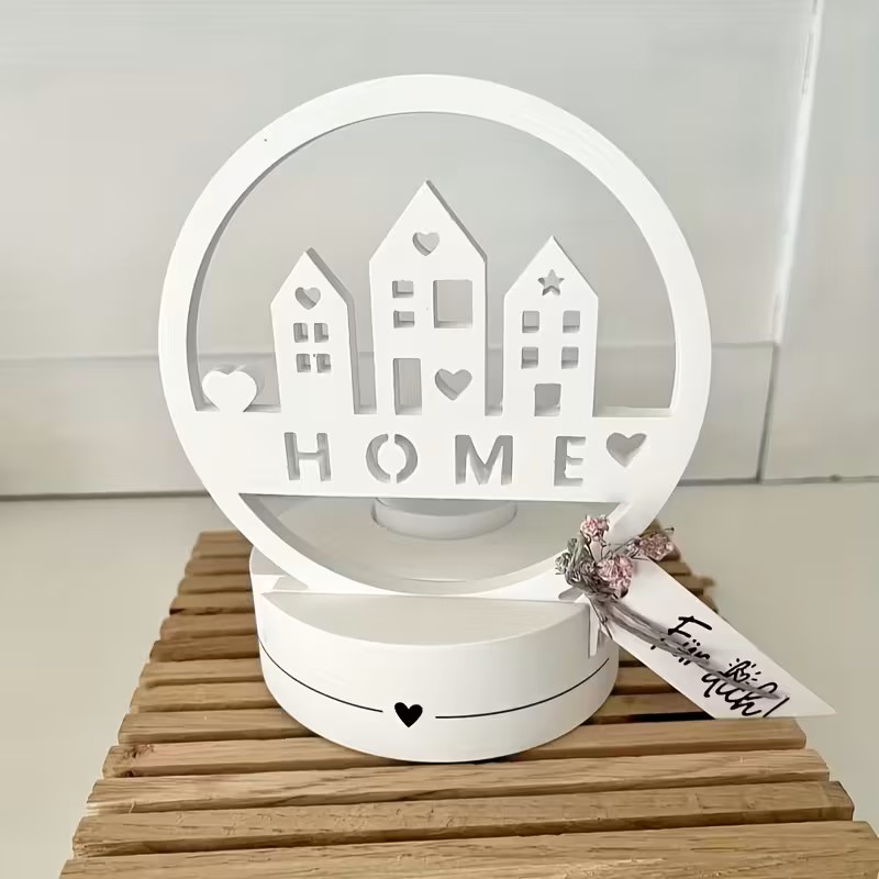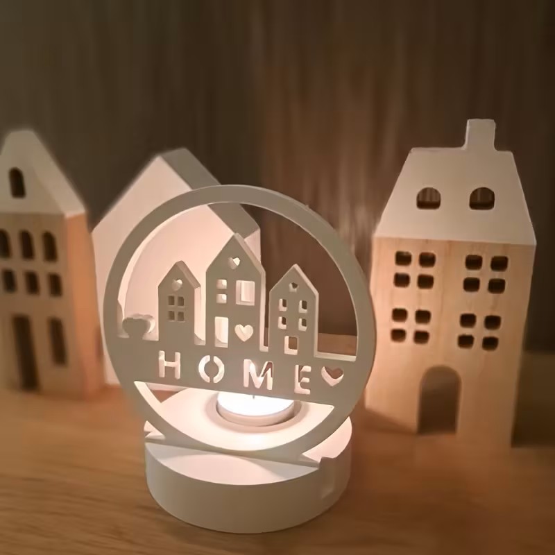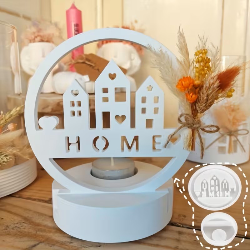• Design: Features a modern, circular frame with a charming house silhouette and the word “HOME” in a cutout design. The base is cylindrical with a small heart accent, designed to hold a standard tea light or small candle.