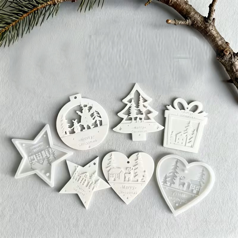 These finished Christmas ornaments made from high-quality casting powder are beautifully handcrafted with fine details and a smooth, elegant finish. Each ornament features a festive winter design with raised motifs such as houses, trees, stars, and reindeer, along with the classic “Merry Christmas” message.