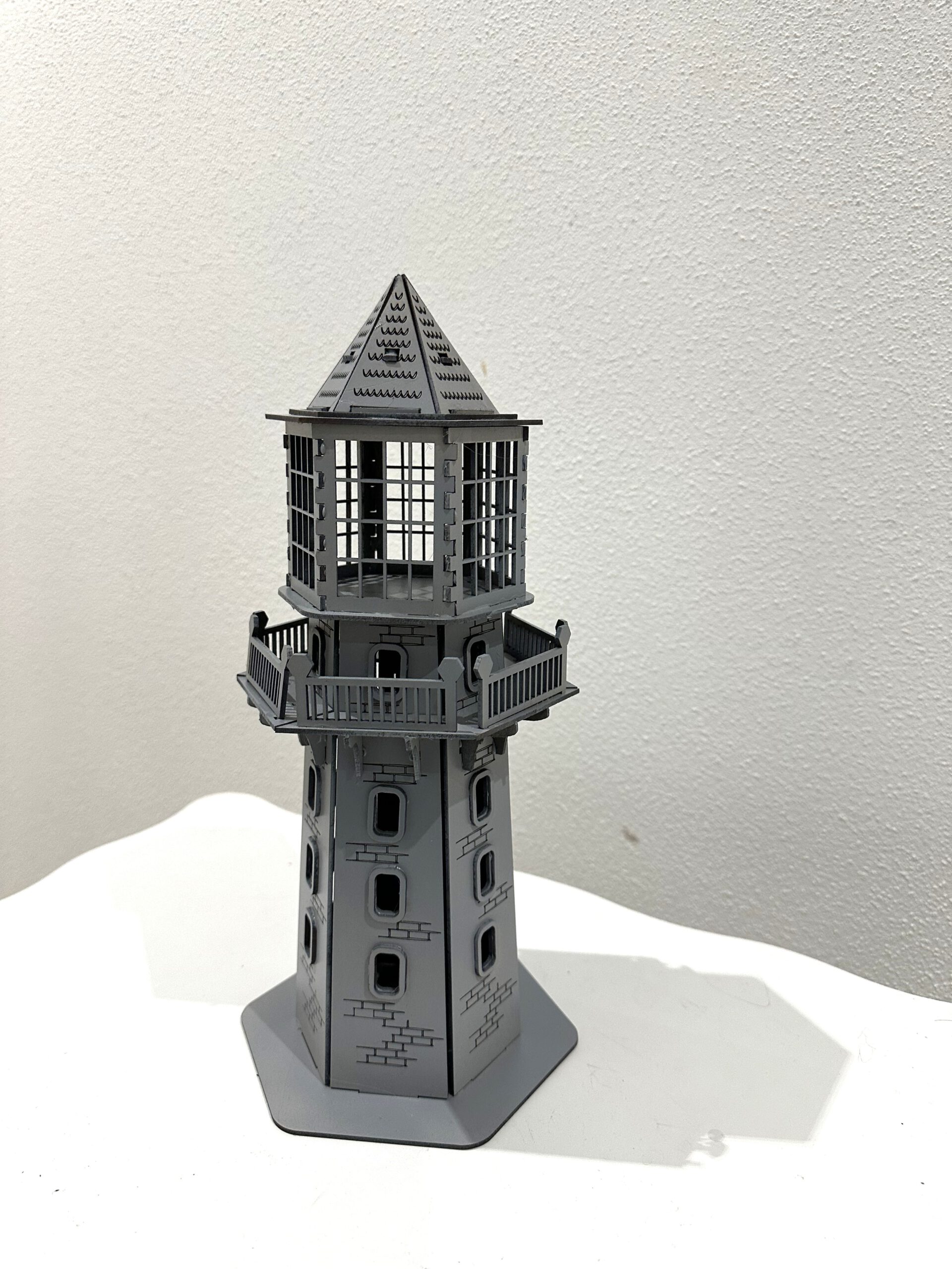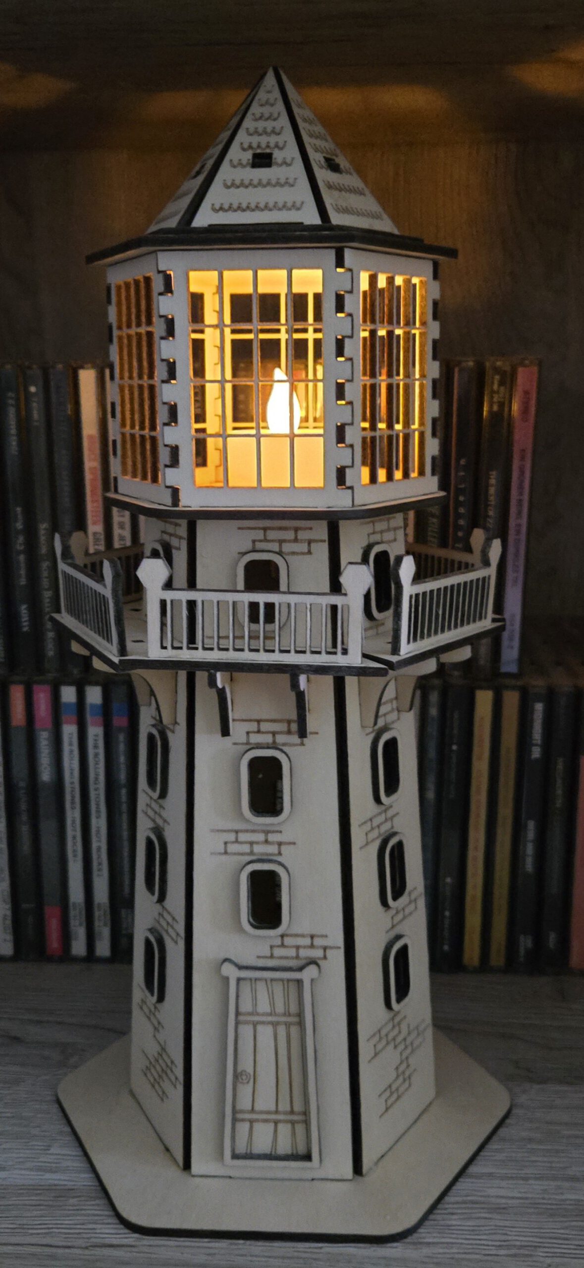 This beautifully crafted laser-cut plywood lighthouse is a unique decorative masterpiece inspired by classic maritime architecture. Designed with detailed windows, balcony railings, and structured tower elements, this wooden lighthouse creates an elegant and cozy atmosphere in any space.